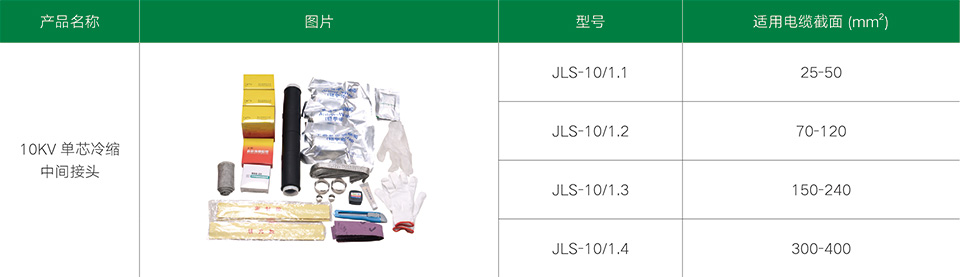 10KV單芯冷縮中間接頭適用于3.6/6、6/10、8.7/10、8.7/15kV單芯聚乙烯和交聯(lián)聚乙烯電力電纜。采用液態(tài)硅橡膠制造,集防水、應(yīng)力控制、屏蔽、絕緣于一體。具有良好的電氣性能和機(jī)械性能,能在各種惡劣的環(huán)境條件下長(zhǎng)期使用。具有重量輕、安裝方便等優(yōu)點(diǎn)。廣泛地應(yīng)用于電力、石油、化工、冶金、鐵路、港口和建筑等各個(gè)領(lǐng)域。
