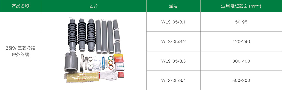 35kV三芯冷縮電纜附件系列產(chǎn)品,適用于21/35、26/35kV三芯聚乙烯和交聯(lián)聚乙烯電力電纜。冷縮電纜附件采用進(jìn)口液態(tài)硅橡膠材料制造而成,不但具有十分優(yōu)良的電氣性能,而且還具有優(yōu)異的憎水性、高彈性、使用壽命長(zhǎng)及恒定的收縮壓力等物理特性。采用冷縮電纜附件,無需明火及特殊工具,只需輕輕抽取塑料支撐條即可,就能自動(dòng)收縮復(fù)位,安裝非常方便于工作。具有良好的電氣性能和機(jī)械性能,能在各種惡劣的環(huán)境條件下長(zhǎng)期使用。具有重量輕、安裝方便等優(yōu)點(diǎn)。廣泛地應(yīng)用于電力、石油、化工、冶金、鐵路、港口和建筑各個(gè)領(lǐng)域。