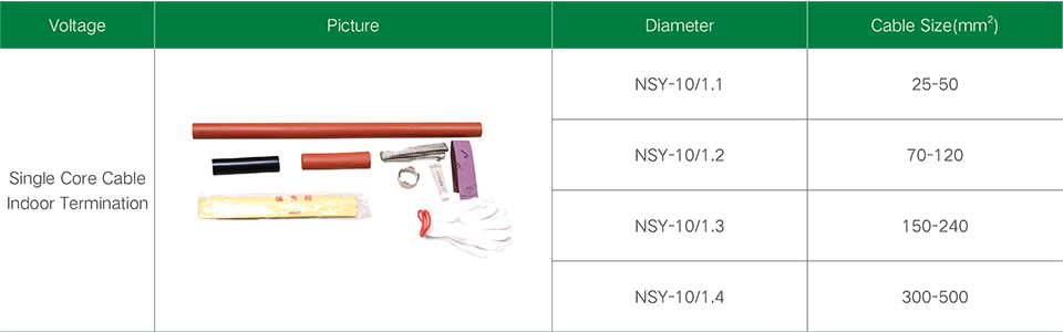 10KV single-core heat shrinkable cable termination accessory is a kind of cable termination connection and insulation protection equipment used in high voltage (10 kV) power distribution system. It is mainly used at the terminal joint of single-core power cables to provide reliable connection and insulation protection.