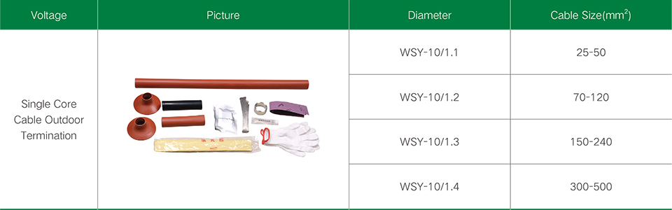 10KV single-core heat shrinkable cable termination accessory is a kind of cable termination connection and insulation protection equipment used in high voltage (10 kV) power distribution system. It is mainly used at the terminal joint of single-core power cables to provide reliable connection and insulation protection.