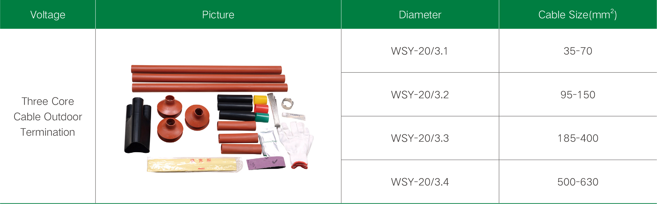 20KV three-core heat shrinkable cable termination accessories are commonly used in power transmission and distribution systems to connect single-core cable terminations between transmission lines, substations and power distribution equipment. They ensure reliable connection and insulation protection of cable terminations and guarantee safe and stable power transmission. They provide reliable cable glands to ensure proper operation of equipment and efficient power transmission.