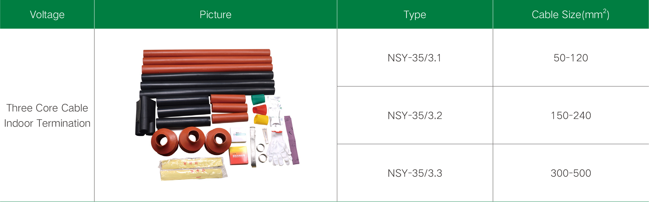 35KV three-core heat shrinkable cable termination accessory is a terminal connection and insulation protection equipment for high-voltage (35kV) three-core power cable. It is suitable for the terminal part of three-core power cable, is used to connect cables with equipment or power distribution systems, and provides reliable cable insulation and connection performance. 35KV single-core heat shrinkable cable termination accessories are widely used in high-voltage (35kV) power distribution systems for connecting and insulating the terminal part of single-core power cables.